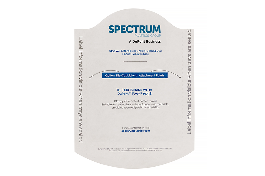 Spectrum offers coated lids CT1073, CT1059, and CT2FS. These products can be printed, unprinted. die-cut or square-cut. Respectively CT1073, CT1059, and CT2FS are made from DuPont™ Tyvek® 1073B, 1059B, and 2FS providing the highest level of protection for your most demanding applications.